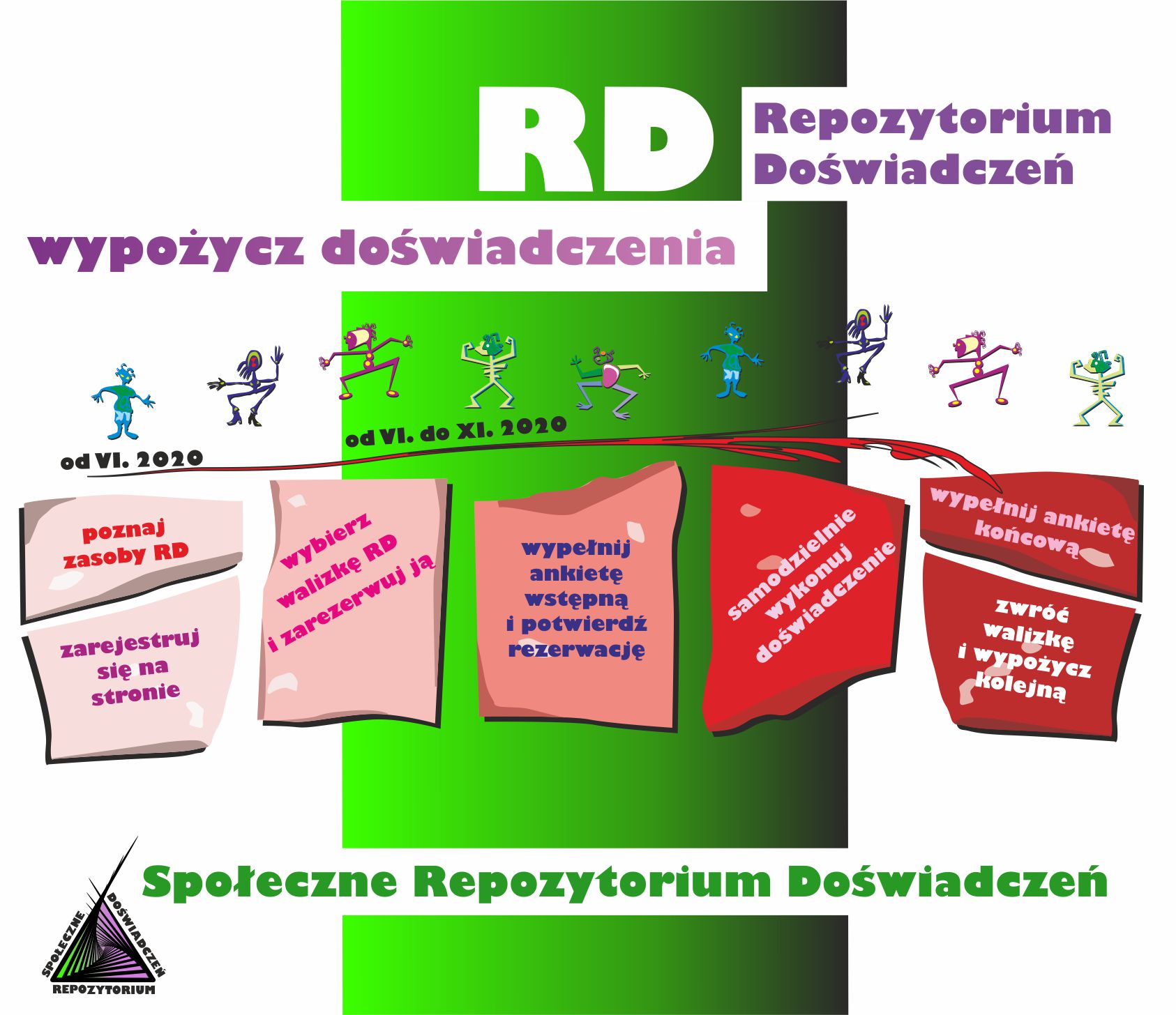 Użytkownik indywidualny (uczeń, członek koła naukowego, członek organizacji, nauczyciel, osoba fizyczna) lub instytucjonalny (nauczyciel reprezentujący klasę, szkoła, gmina) zgłasza chęć skorzystania z zasobów RD wskazując numer walizki oraz termin i okres wypożyczenia zasobów w internetowym systemie Repozytorium Doświadczeń. Obsługa RD weryfikuje dostępność zasobów i kontaktuje się z użytkownikiem. Walizka RD jest przekazywana użytkownikowi, a po zakończeniu okresu wypożyczenia – zwracana na adres siedziby Stowarzyszenia LuTEN. W okresie realizacji Projektu od użytkowników RD wymagane jest wypełnienie ankiet wstępnych i końcowych pozwalających na ewaluację Projektu. Zespół Projektowy zrealizuje zajęcia pilotażowe z wykorzystaniem zasobów RD dla tych grup, które w procesie rekrutacji/rejestracji w systemie wypożyczenia zasobów RD przedstawią 3÷7 argumentów uzasadniających, dlaczego RD powinien być realizowany w ich klasie.