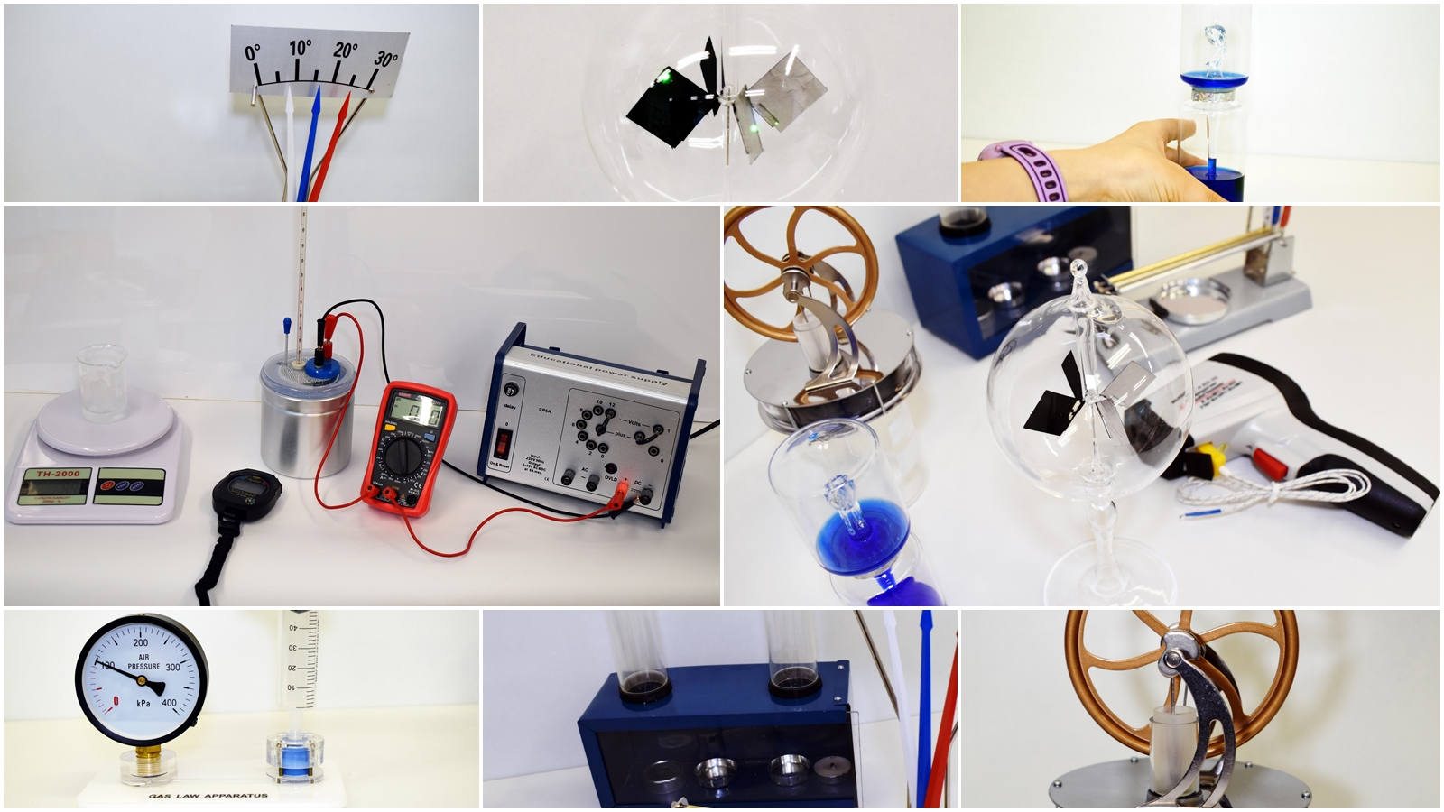 Zestaw do demonstracji doświadczeń z termodynamiki. Bogaty zestaw umożliwia pokazanie wielu doświadczeń m.in. z rozszerzalnością temperaturową ciał stałych (liniową i objętościową), przenoszeniem ciepła (konwekcja w gazach i cieczach, przewodnictwo cieplne), demonstrujących zasady termodynamiki oraz zasady działania silników cieplnych.